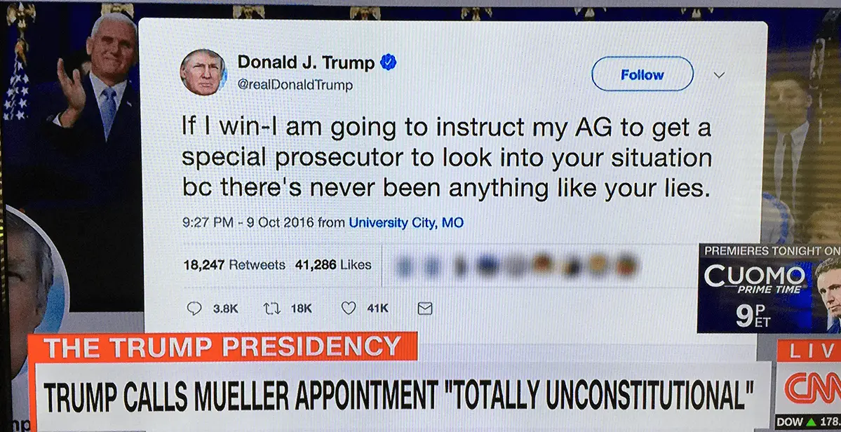 The appointment of the Special Counsel is totally UNCONSTITUTIONAL! Despite that, we play the game because I, unlike the Democrats, have done nothing wrong!