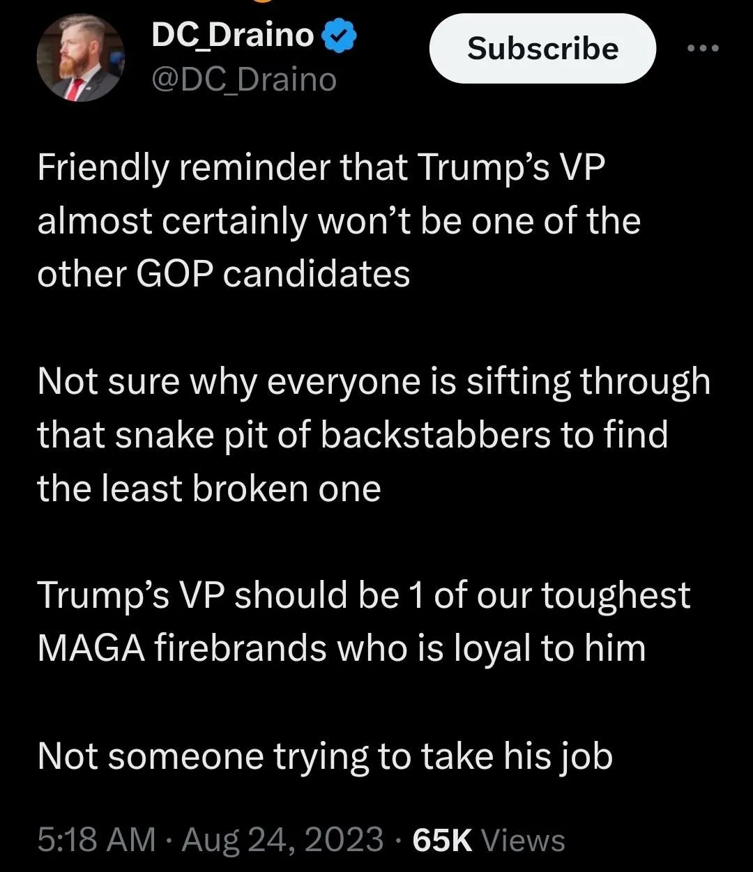 for once we agree on something. Nikki had a few good lines but overall came across as a female Pence. Trump won the night, Vivek and Scott made good cases for being VP. the rest are done.No question Trump won