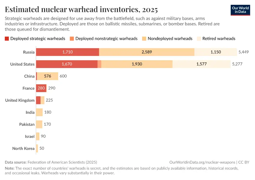 How many states have nuclear weapons, and how many warheads do they have? How is this changing over time? Explore research and data on nuclear weapons.