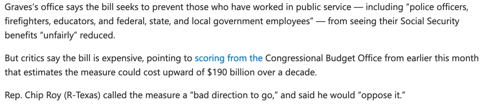 The bill at the heart of the push, also dubbed the Social Security Fairness Act, seeks to do away with the Windfall Elimination Provision (WEP) and the Government Pension Offset (GPO), a proposal that backers on both sides of the aisle argue is long overdue.