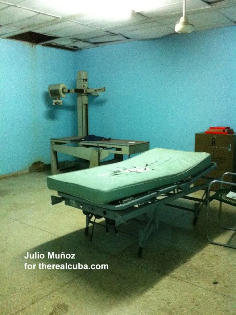 His parents hurt a finger, and needed an X-ray. This is the x-ray room. Ripped bed. 1960s, or 70s x-ray machine. Water damage through the ceiling, and walls.