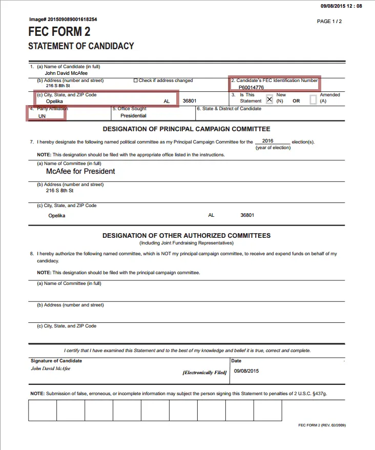 The paperwork was confirmed as authentic by Kyle Sandler, who is identified as one of the campaign’s directors and responded to a request for comment from a contact form on McAfee’s personal website. The filing lists an Alabama address, and noted that McAfee would be “founding a new party yet to be announced.”