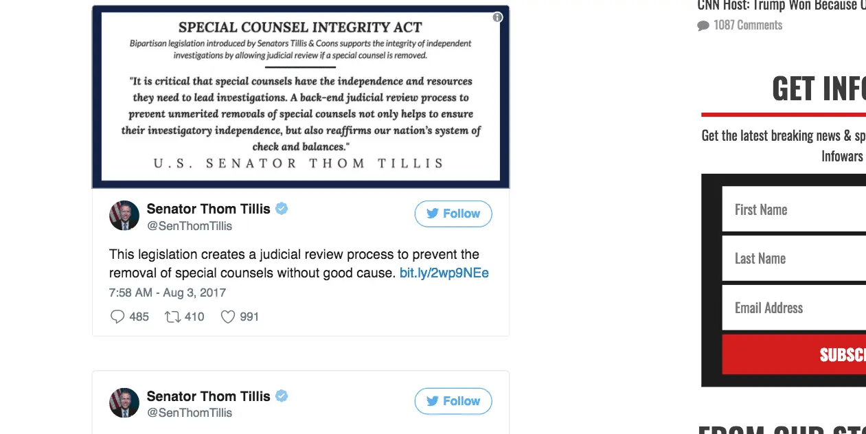 Republican turncoat Senator Thom Tillis of North Carolina has joined with Democratic Senator Chris Coons of Delaware in crafting a bill to ensure Robert Mueller and his band of Democratic donors can overthrow our democratically elected president.