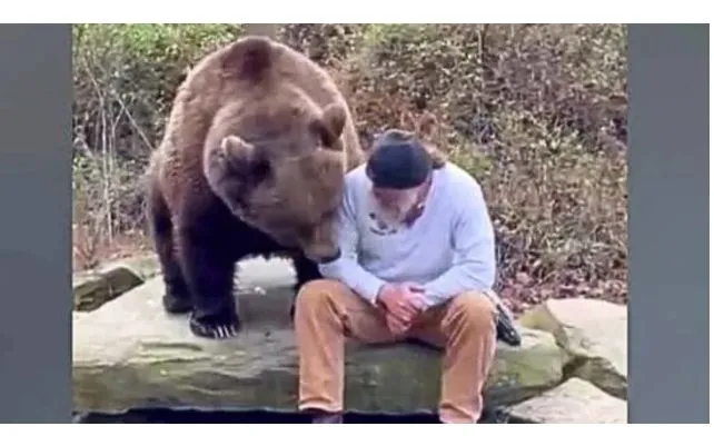In the heart of the wilderness, a remarkable encounter unfolds as a man forms an unlikely bond with a majestic brown bear.
