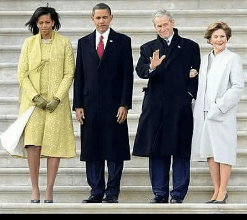 Conversely, Mrs. Bush is not only 'clinging' to her husband, but you'll note she's shifted the angle of her body so that she almost appears to be standing 'behind' her husband. Now, I wouldn't say she's less confident exactly, but I'd certainly say she was 'more traditional' in her views on marriage. She seems to want everyone to know that she's not the person they need to talk to. (Again, its not a bad style per say, merely a reflection of different opinions and upbringings.)