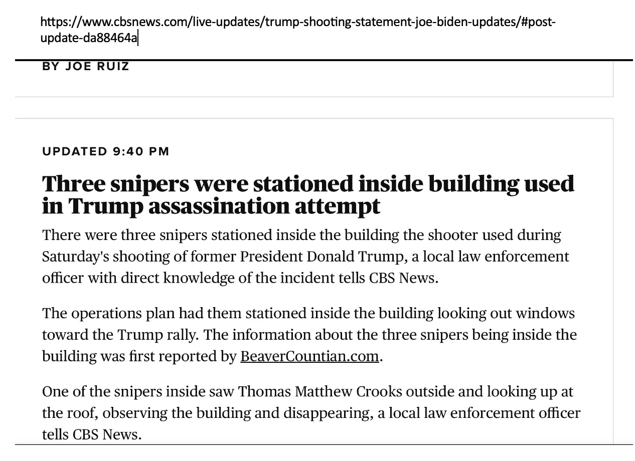 3 government snipers inside the building the assassin Crooks was on and shot Trump! Why didn't they know?