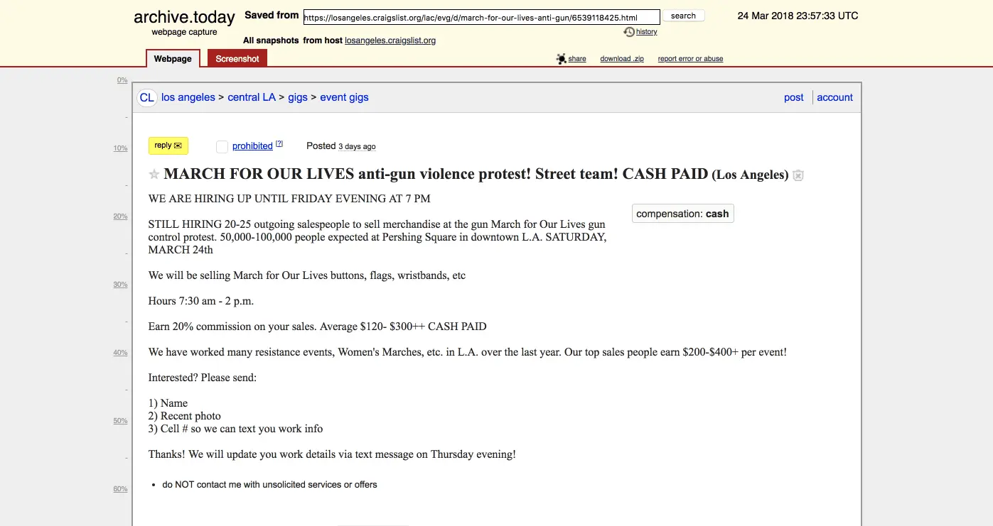 “Here’s just one of many of the Craigslist ads where Soros Organizers were recruiting PAID protestors for #MarchForOurLives ! Don’t expect the MSM to talk about this,” the Editor In Chief for The Washington Reportertweeted.