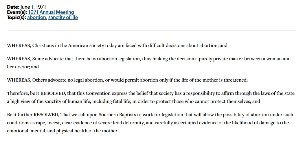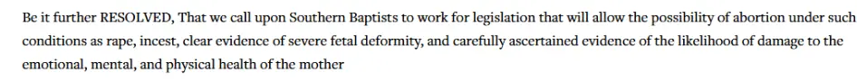 Southern Baptists once officially called for laws to allow abortion under such conditions as rape, incest, clear evidence of severe fetal deformity, and carefully ascertained evidence of the likelihood of damage to the emotional, mental, and physical health of the mother. Were they evil when they published that resolution in 1971 ?