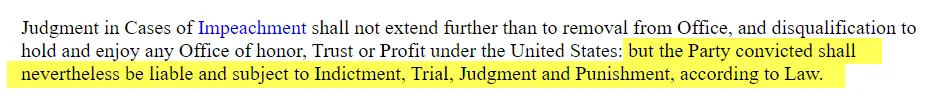 Specifically points out that impeachment is for the removal from office so that the individual can then be subject to indictment, trial, and punishment under the law.