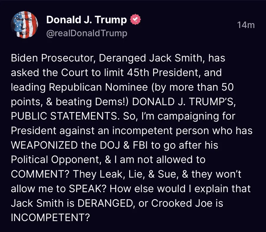 That's not gonna last long.Special Counsel Seeking Limited Gag Order on Trump in Election Case