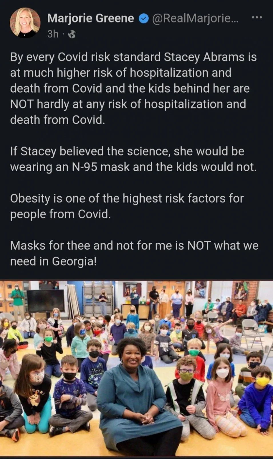 We all know that the masks do very, very little. Stacy knows that, the adults know that. It isn't about the disease, it is about cowing the children, and reducing their noise and exuberance. It is about making them docile to authority.