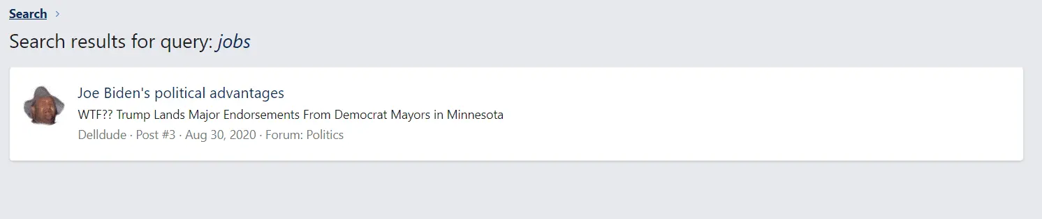 Keep trying.I did. I did a search for "jobs" by you between Jan 2017 and Jan 2021 and it came back with one hit.