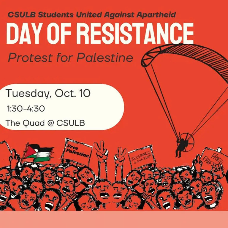 The La Fuerza Student Association shared a poster for the “Day of Resistance: Protest for Palestine” event featuring a drawing of protesters carrying a Palestinian flag, with a paraglider in the corner.