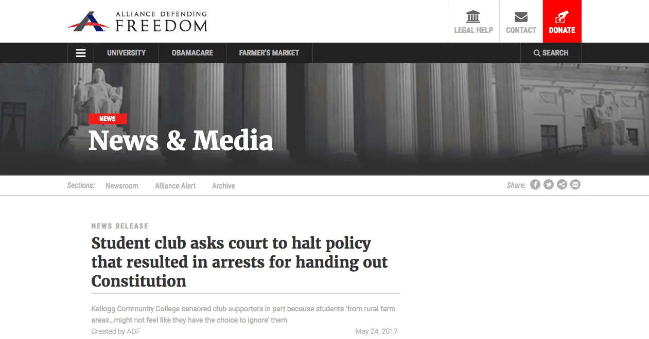 GRAND RAPIDS, Mich. – Alliance Defending Freedom attorneys representing a Young Americans for Liberty chapter and one of its student organizers at Kellogg Community College in Battle Creek filed a motion and brief in federal court Wednesday that asks for the school’s speech policies to be suspended after campus security arrested three people handing out copies of the U.S. Constitution while talking with students about the club on a sidewalk.