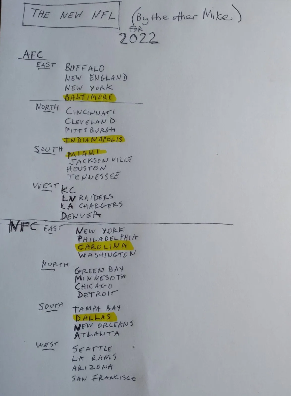Whatever. You suggested something and I told you why it wasn't a good idea then you went off on some time zone and snow fall tangent. If this were 1965 then keeping teams in the same areas would make sense but since it's not there's no reason to break up divisions with years of built-up rivalries so the fan bases are in the same time zone. Which this list doesnt do either but whatever. Like why does Dallas being in the same division as Tampa and Atlanta make any more sense than the one they are currently in? The flight time difference is 30 mins Dallas-Tampa vs Dallas-NY.It was not an argument, dude. It was a trivial suggestion that you decided to question me about for whatever reason.