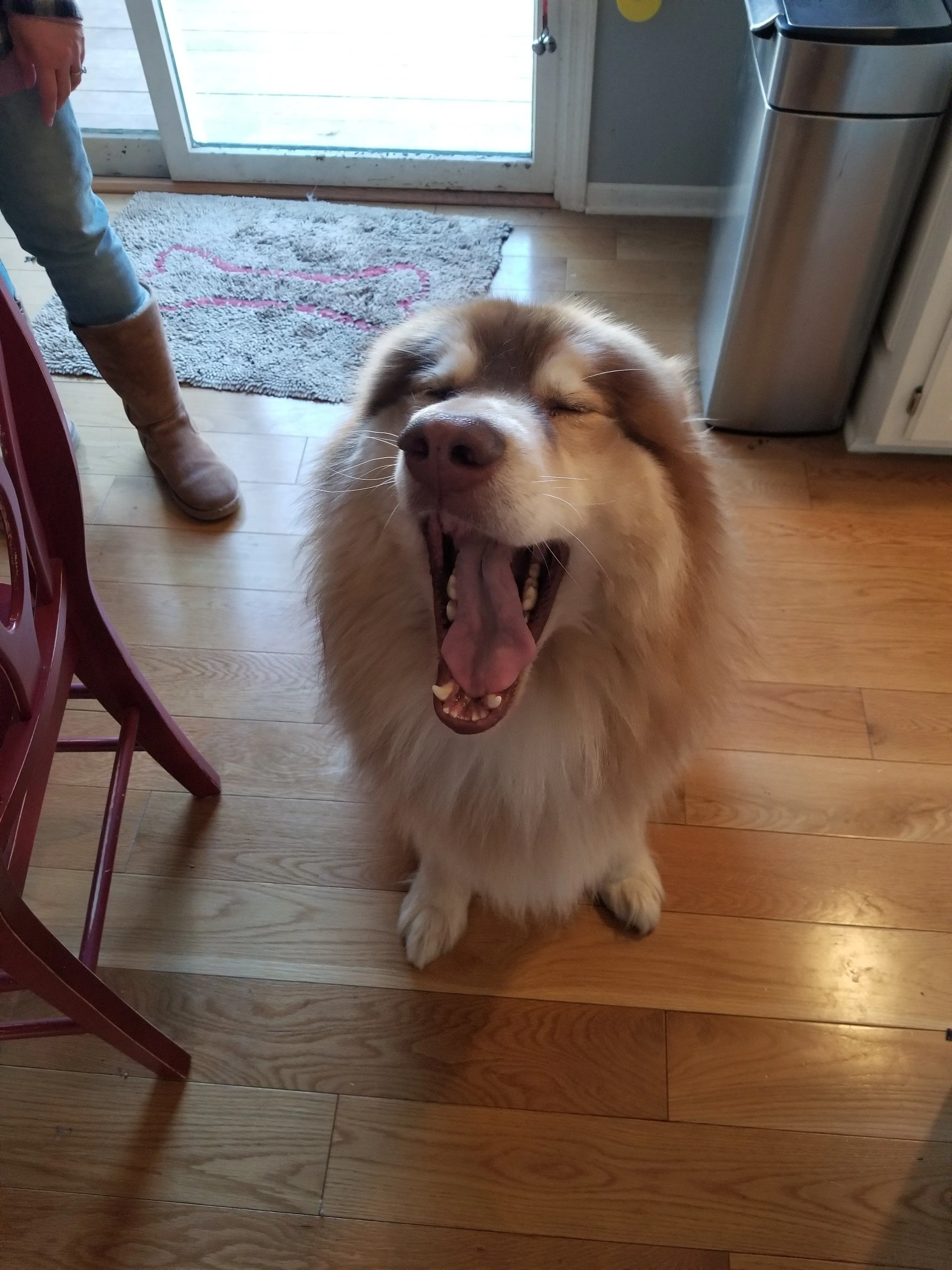 Absolutely beautiful dog. Native American something or other. Huge and the picture doesn't really show it. He rings a doorbell to be let back in the house or out to pee. Big enough for my grandkids to ride and friendly as any dog I've ever run into on a jobsite.
