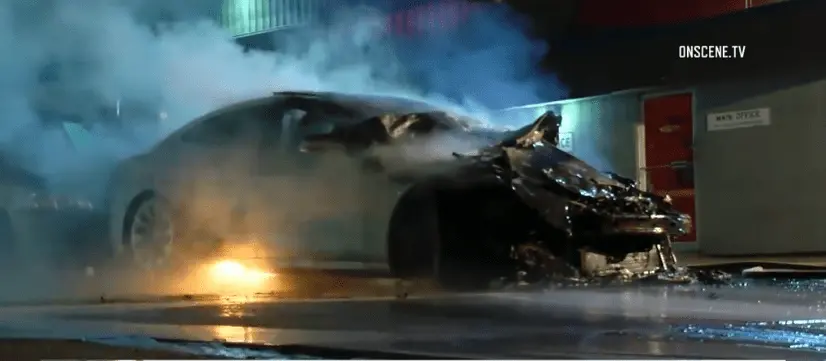 Brand new car, gets a flat tire warning. Takes a fire crew thousands of gallons of water and 16 hours later, the owner is left with this: