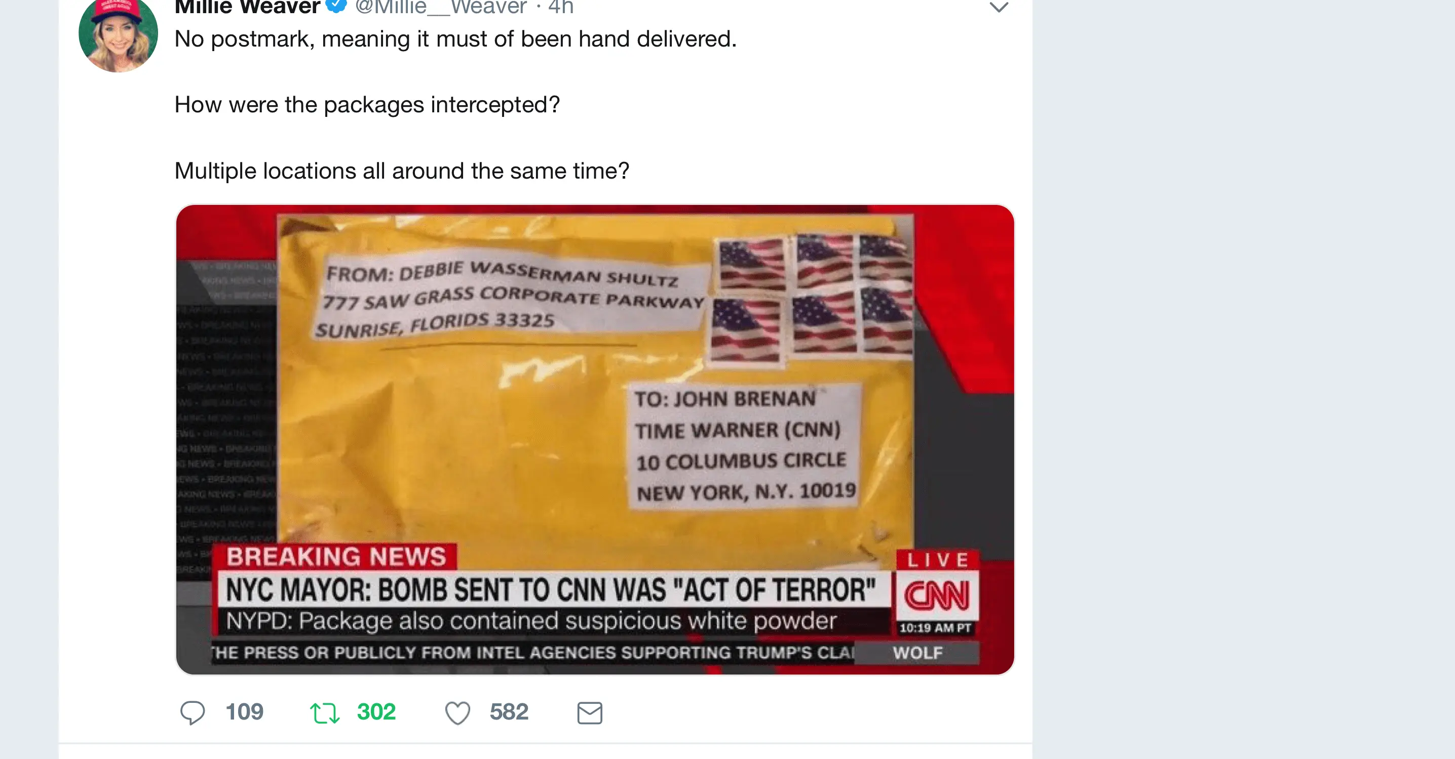 So some whacked-out zealot or zealots figured this was a good time to throw a monkey wrench into everything. Maybe it's some right wing whacko juiced up on Trump rallies and talk radio. Maybe it's some left wing whacko in a panic over "news" that the "blue wave" might be ebbing, desperate for some sympathy votes.