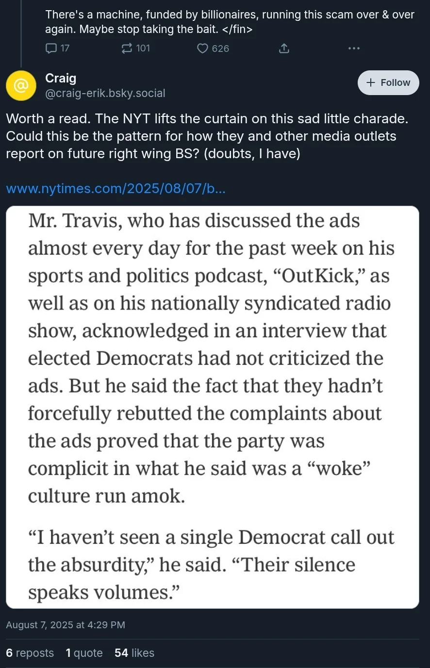 Anyway, to summarize/conclude: this silly Sweeney cycle, wherein a largely imaginary lib backlash leads to weeks of everyone shitting on Dems, is the entire last decade of US politics in miniature. Dems are forced to answer for any & every rando that anyone can find online ...