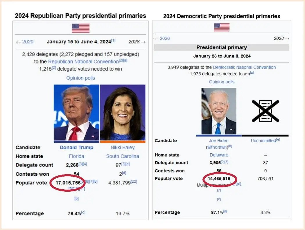 Lets see, Donald Trump was nominated without having to promary. He didn't show up for debates and he was basicaly installed.The Dem party bosses staged a coup and forced the lawful nominee out of the race. THEN just installed puppet Kamala without a single vote being cast. What happened to the U.S.A.? Oh wait, corrupt Dems took over. Welcome to the new Dem banana republic.