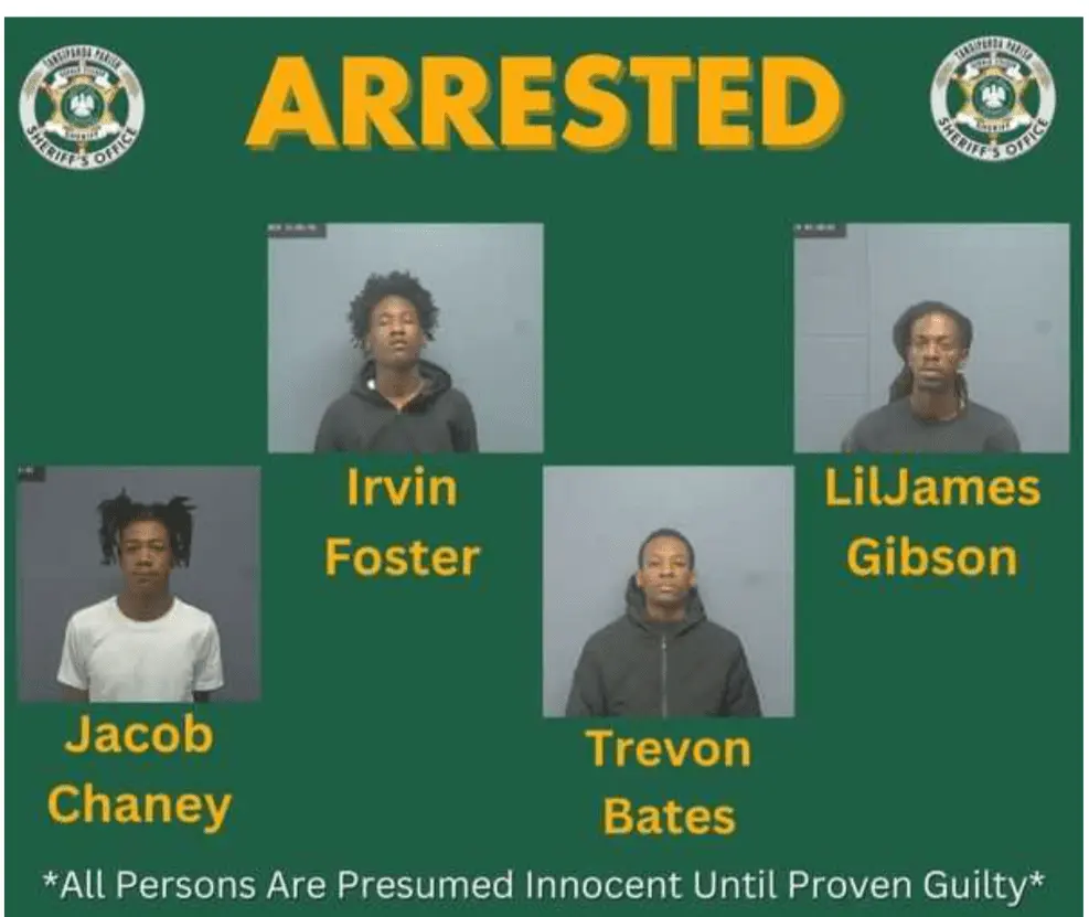 Jacob "Spanky" Chaney, 18, of Independence, Irvin "Teezy" Foster, 18, of Amite, Trevon "Treco" Bates, 19, of Fluker, and LilJames "Nuke" Gibson, 25, of Fluker, were arrested.