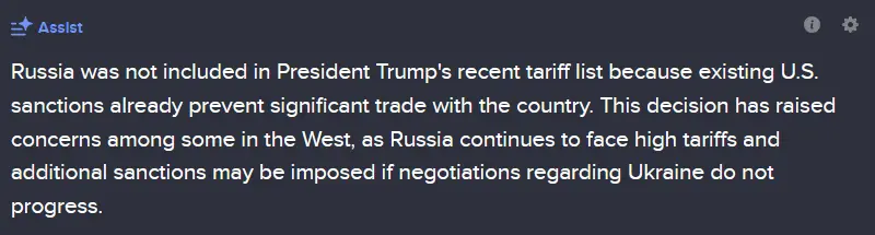 No. There is no specific additional tariff on Iran, not that it would matter. Anything you read applies to the flat 10% bottom....And yet Iran, perhaps sanctioned just as much, was slapped with a tariff by Trump. How much trade do we do with Iran? Not nearly as much as we still do with Russia, despite the sanctions.