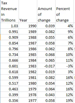 The first column is the tax revenue for each year taken from my link.