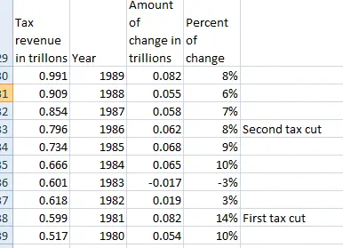 The 5 years prior to the first Reagan tax cut the percent of change for tax revenue was 16%, 11%, 14%, 10% and 14% for an average increase of 13%. The 5 years after his first cut the percent of change was 3%, -3%, 10%, 9%,8%, for an average change of 5%. Then Reagan cut taxes again and the next 5 years were 7%, 6%, 8%, 4%, 2%, which once again comes out to an average change of 5%.