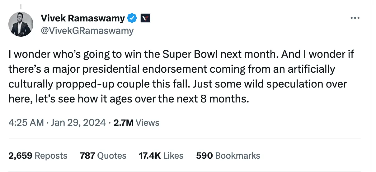 Jesse who? Is he on this thread? Everyone on this thread has been fine. If you are stupid enough to think all Maga hate Swift because a couple of magas went after her, then so be it.You think the left is making up Jesse Watters' insane psy-op theory? You think the left is making up Vivek's batshit conspiracy theory about Taylor Swift and the Superbowl?
