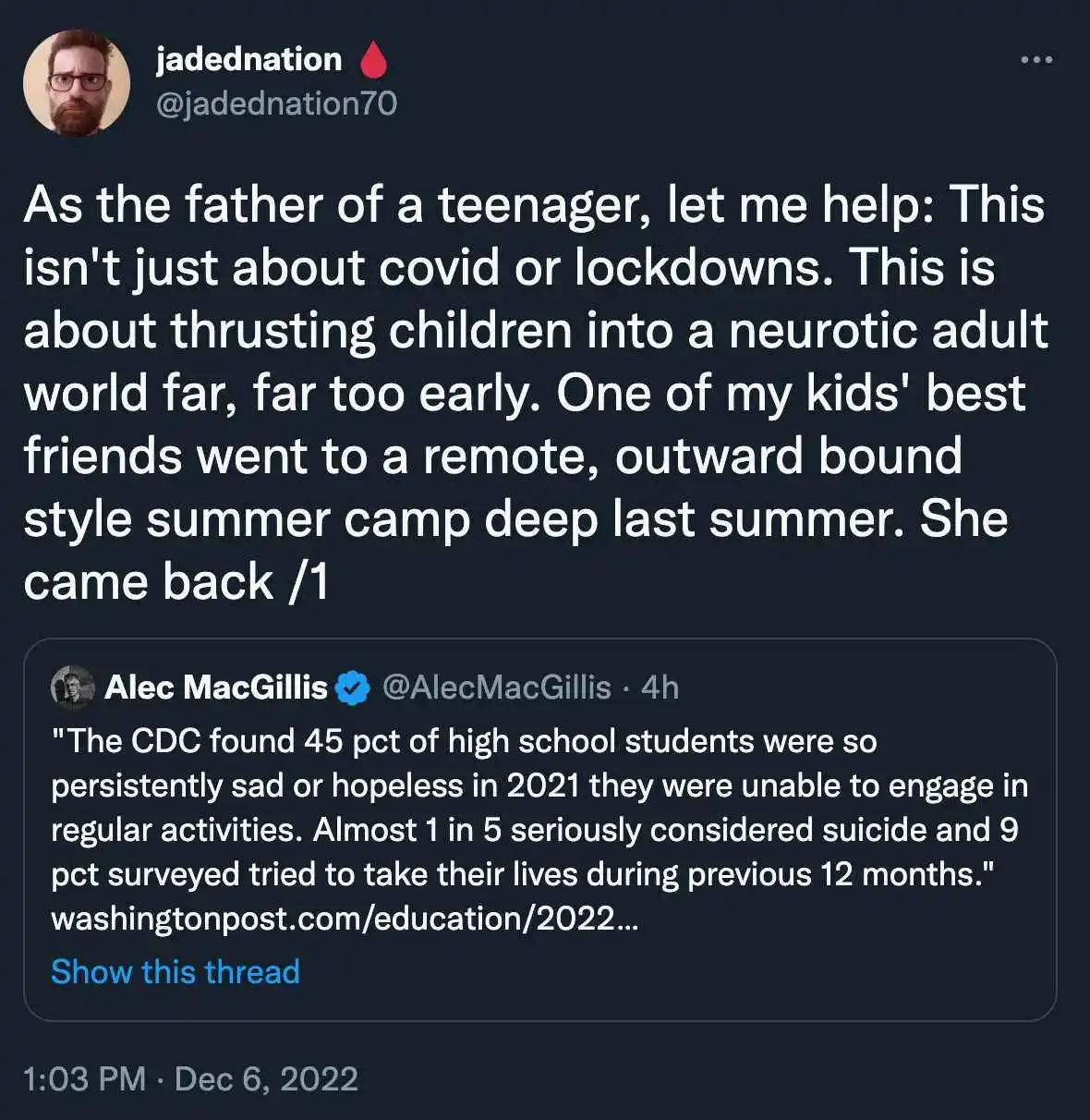 One thing I know about Ted Cruz is he isn’t going to do that ever.Unfair. Can’t stand Cruz but even the best parents have faced these horrible things with their kids. You are right about the pressures kid’s today face, and mental health issues are rising. If there is a positive, maybe Cruz will start advocating for more resources to put into it. We have a Representative who’s daughter has anorexia and he put forward a bill that passed to create programs in schools to recognize signs of it early and get help.