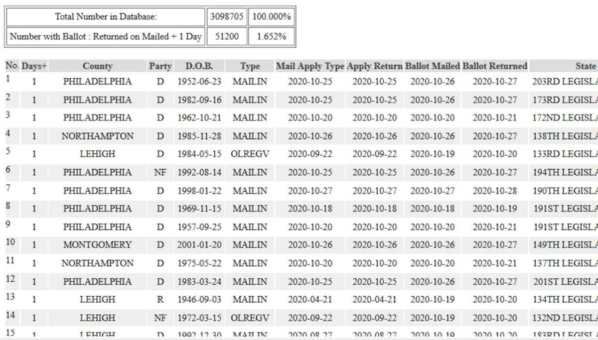 A screenshot of publicly available mail ballot data in Pennsylvania showing the date when ballots were sent out (3rd column from right) and received (2nd column from right) only one day apart. (Data source: Pennsylvania Secretary of State)