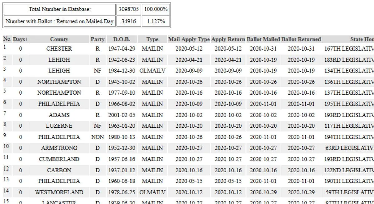 A screenshot of publicly available mail ballot data in Pennsylvania showing the date when ballots were sent out (3rd column from right) and received (2nd column from right) on the same day. (Data source: Pennsylvania Secretary of State)