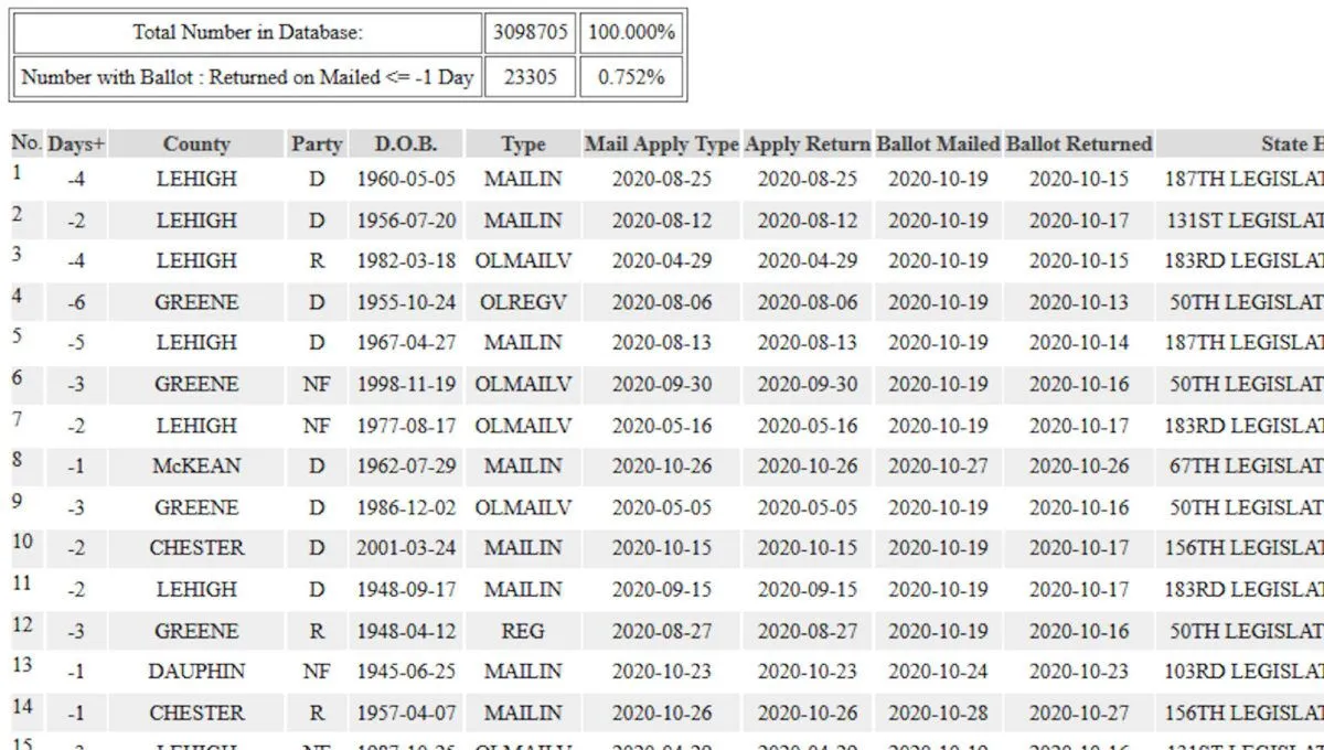 The dataset made public by Pennsylvania’s Secretary of State was last updated on Nov. 10, 2020, and “describes a current state of mail ballot requests for the 2020 General Election.” The data includes the mail and return dates.