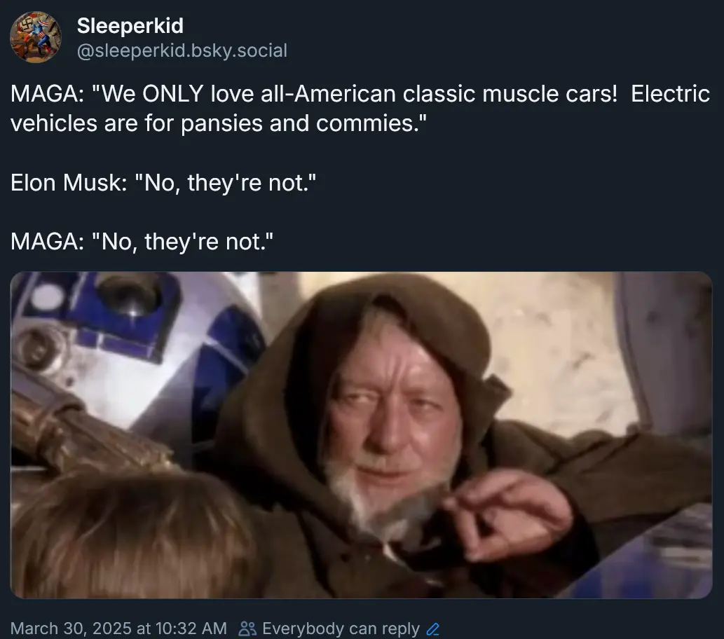Who da hell is buying EVs. My opinion on them hasnt changedSo I was just saying on another thread that Elon is a globalist who became a "Republican" because the powers-that-shouldn't-be want to get the right on board with ideas that they otherwise would never accept, if those same ideas were presented by a Democrat.