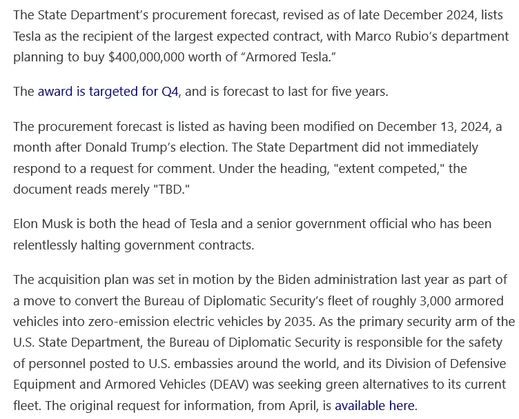 The State Department’s procurement forecast, revised as of late December 2024, lists Tesla as the recipient of the largest expected contract, with Marco Rubio’s department planning to buy $400,000,000 worth of “Armored Tesla.”www.dropsitenews.com