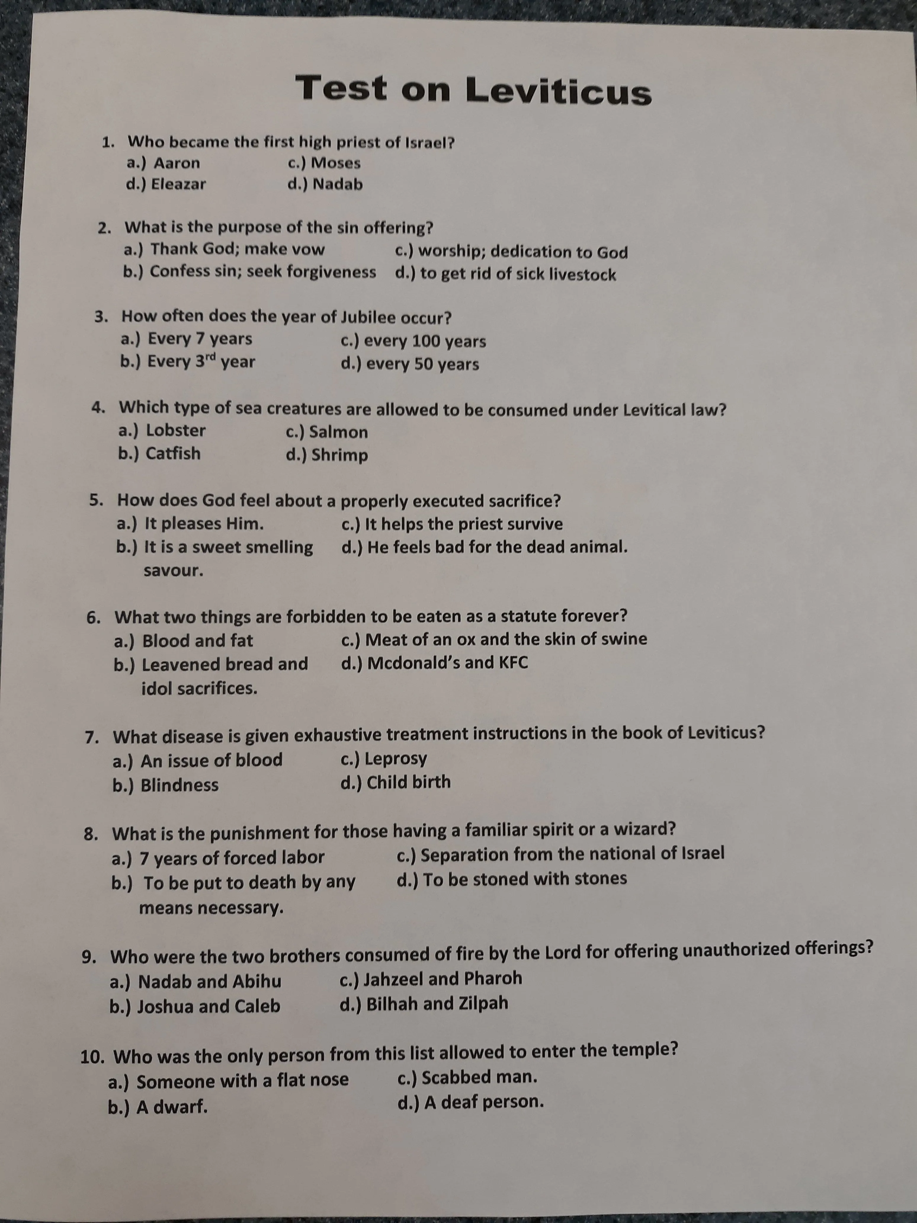 Just for the record I am a 6th grade Bible teacher. Part of my job is giving test. So I guess that is a sort of perch. I do think you should relax. There is no reason for you to attack me in order to protect yourself from the mean ole test. It isn't really that mean. Most 6th graders passed it.