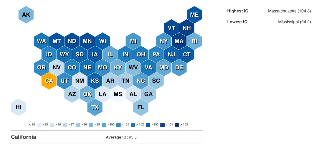 Here we can see the average IQ in CA is 95.5, second only to Mississippi. I see no correlation between "color" of state and IQ. Half the smartest states appear Blue while others are red. Same with the lowest IQs---- some are red states like Miss, La, and Alabama, yet others are Ca, Nevada and New Mexico, blue states.