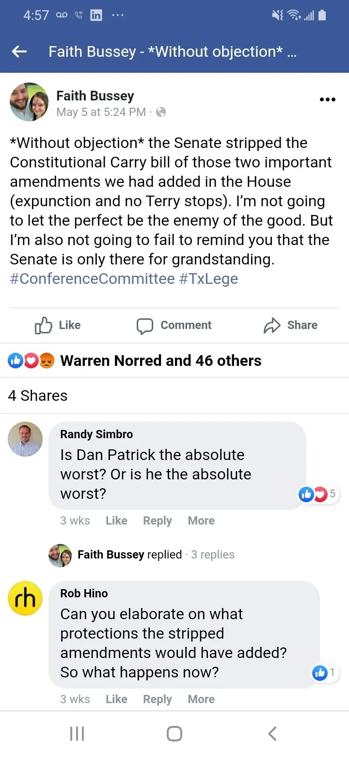 Both chambers passed versions the “constitutional carry” bill that would allow Texans 21 and older to carry a handgun without a license as long as they’re not otherwise prohibited from having a firearm. But changes made to House Bill 1927 in the Senate were not agreeable to the House, and a committee made up of representatives and senators was formed to come up with a compromise bill.