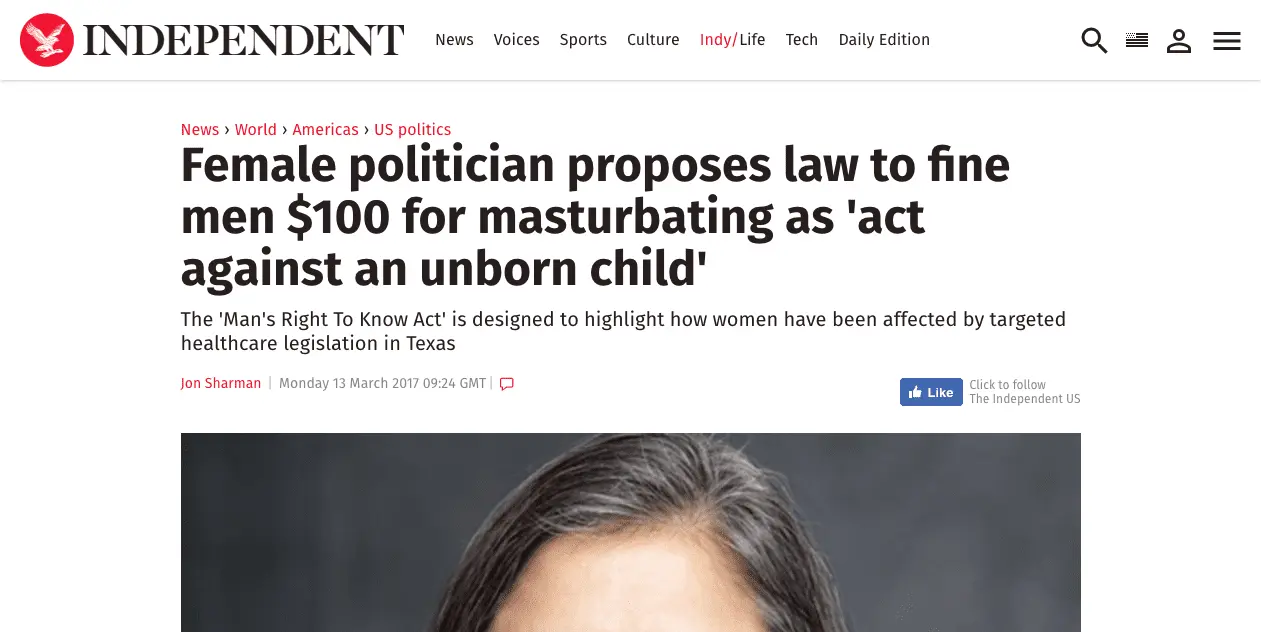 In March, Texas State Rep. Jessica Farrar, D-Houston, filed a bill that would penalize men for "unregulated masturbatory emissions" and the bill has now made its way into the hands of the Texas State Affairs Committee on Tuesday.