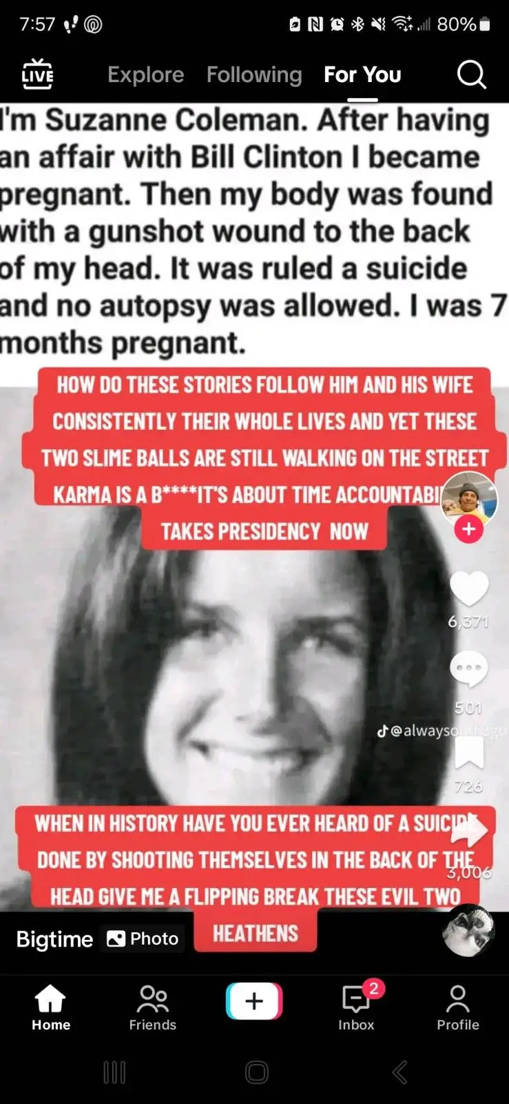 Suzanne Coleman âallegedlyâ died of a self-inflicted gunshot wound to the back of the head. She was pregnant âallegedlyâ with Bill Clintonâs illegitimate baby.
