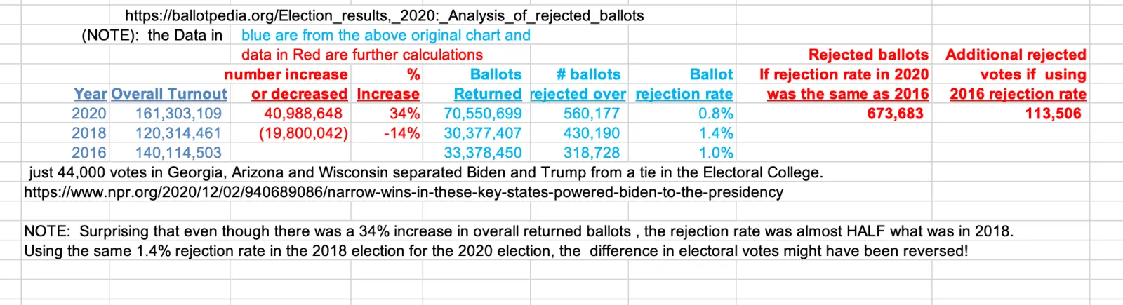 And believe me, folks I want someone impartial to explain how nearly 40 million more ballots were submitted, but the rejection rate was less than the 4 previous years?