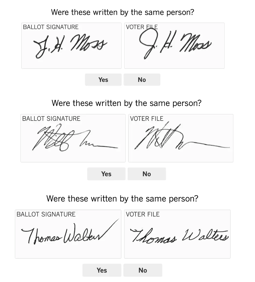 Remember you choose which of the 3 sample signatures are valid? Which the 3 were written by the same person?