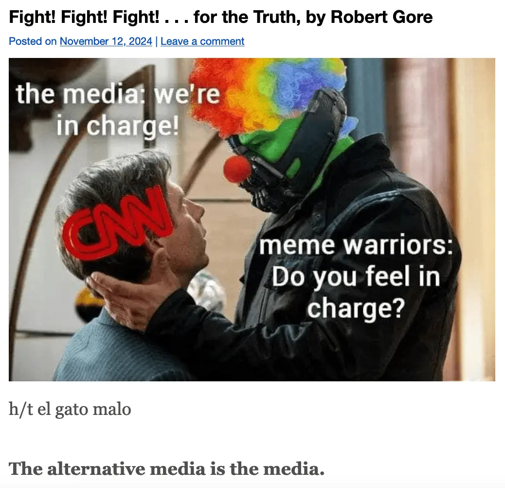 h/t el gato malo The alternative media is the media. Donald Trump would not have won three elections without the alternative media (AM). The mainstream media (MSM) were almost uniformly opposed to …