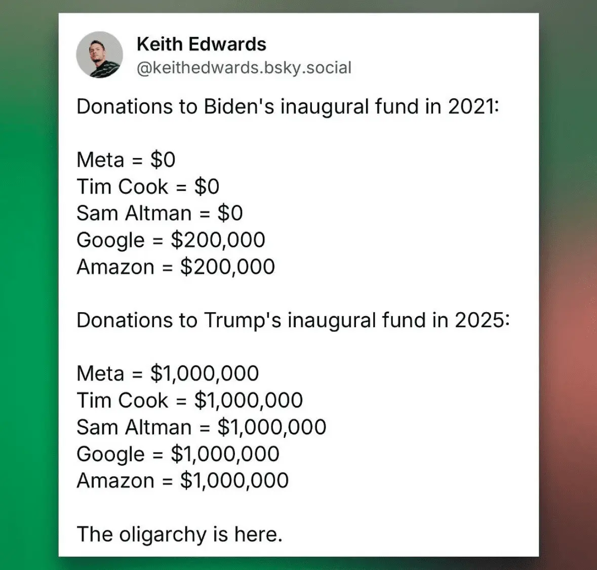 The American Oligarchy installed by you and other gullible Trump voters – the corrupt Trump regime has just begun.