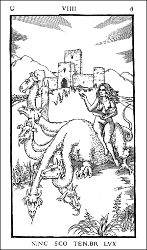 Maybe the scriptural harlot can be a mad female scientist with specially designed metallic spiraling under-support to enable her to move around and whip like an electric-eel and seem like a voodoo mermaid.