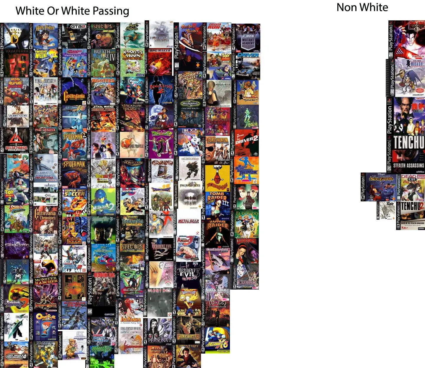Anyways, I'm just here to point out that virtually every character in video games ever are white. That's even in Japanese games, who are notoriously white worshipping and anti black. Nioh came out with a blue eyed, blond haired white male, and none of the Asians or their western white overlords said anything. But one black guy triggers them. Here's a collage of all the PS1 games catalogued on Metacritic, separated by white and non white main characters. You can cherry pick and refute certain selections, I'm sure, but the lopsided nature of it speaks clearly. It's ok to have black characters in media. It's ok to be black. It's ok to be woke. It's ok to erase the thousands of white characters, placed there simply because they are white, and substitute black ones. As black as possible. I hope those in the industry keep doing this. Over and over and over, just like they did with white characters, and continue to do. Blacks must boycott and pirate any game from Rutrackers that isn't woke, and doesn't have at least 50% blacks characters.