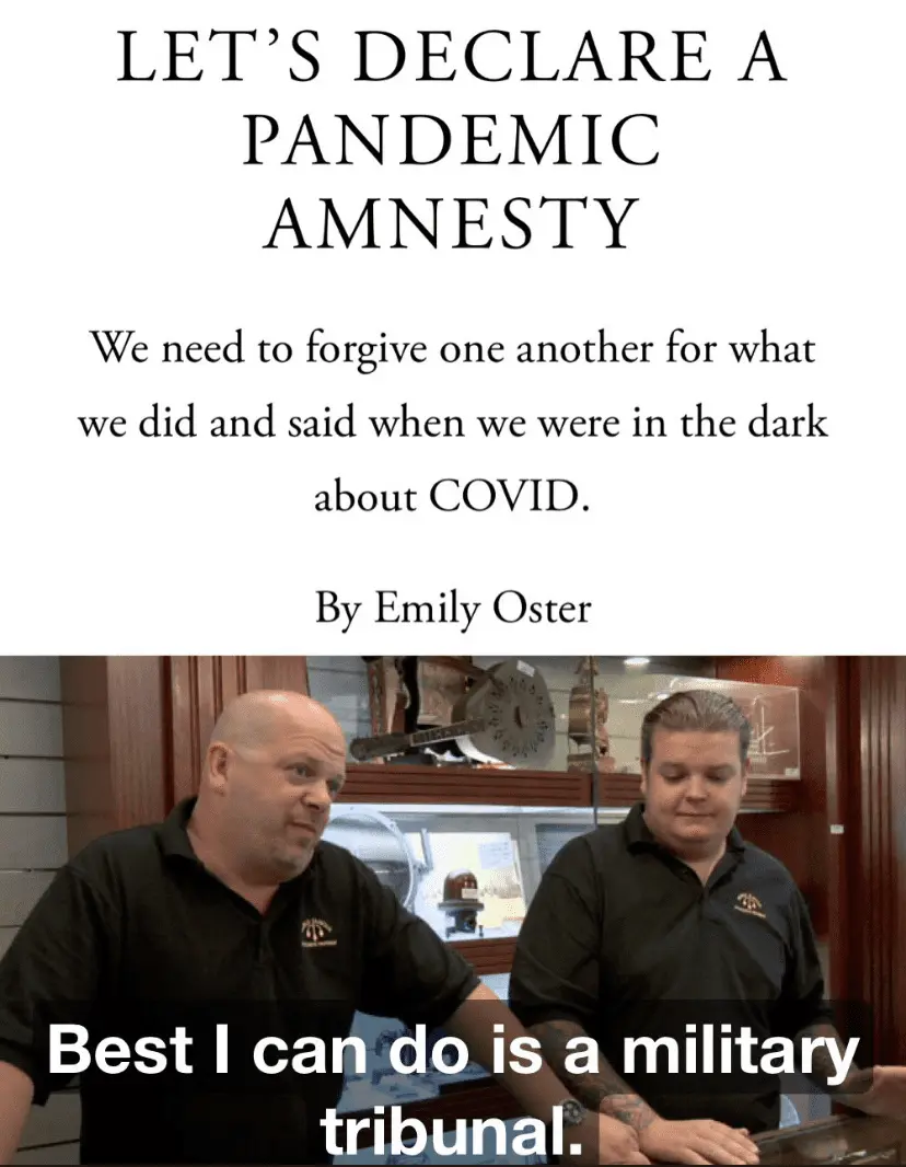 The author surely did not publish this Atlantic article out of honest-to-goodness concern for the nebulous advocates of “bleach injections”. She wants some other acts — and some other players — to be forgiven instead. Prof. Oster is coy about who those people are. I am sure that she is asking for amnesty for our “Covid response leaders”.