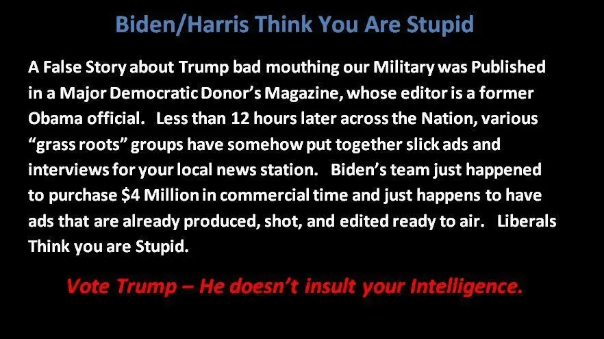Cracks me up how upset the cons are about the Atlantic article, screaming fake news!!..why..because if the article had been about Joe Biden saying those words the cons would believe every word of it and you all damn well know it.
