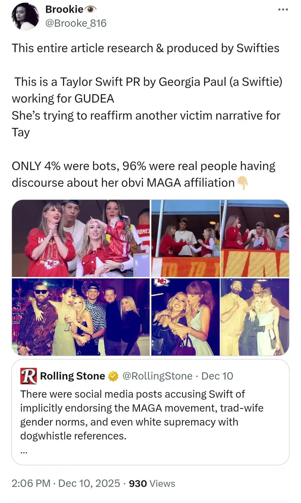 "This entire article research & produced by Swifties. This is a Taylor Swift PR by Georgia Paul (a Swiftie) working for GUDEA. She’s trying to reaffirm another victim narrative for Tay. ONLY 4% were bots, 96% were real people having discourse about her obvi MAGA affiliation."