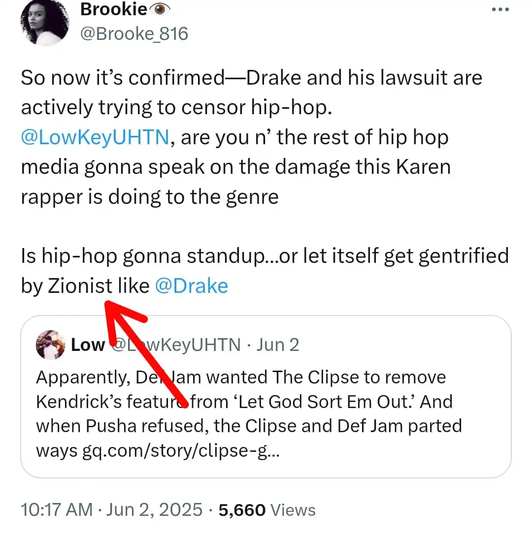 On June 2, 2025, this Brookie @Brooke_816 used the label 'Zionist' on Drake because he is only black through his father, but his mother is Jewish.